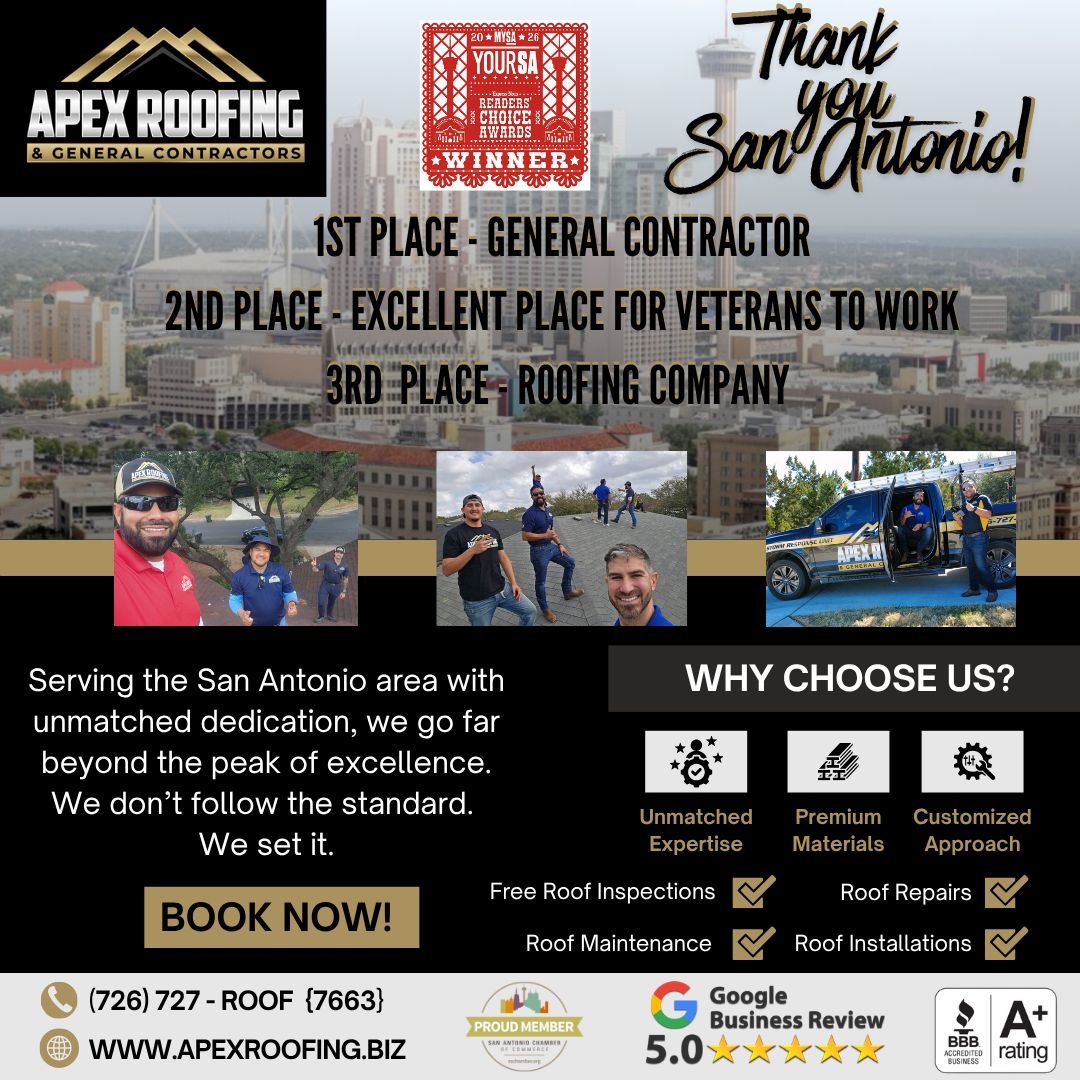 Apex Roofing & General Contractors has been recognized as San Antonio’s top roofing company for 2025, reflecting