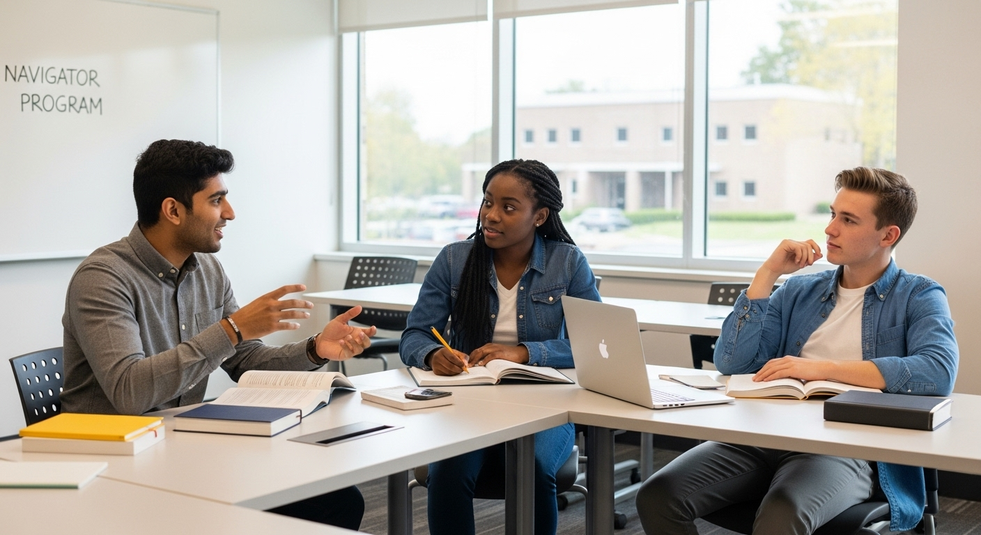 The Navigator Program consists of four sequential courses that span a student’s undergraduate education. This multi-year structure, beginning with a ‘Flight Planning’ course and concluding with a ‘Launch’ seminar, distinguishes it from single-semester orientation programs at other institutions.