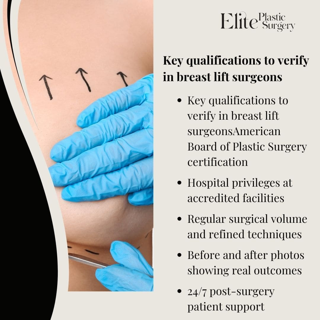 Selecting the right breast lift surgeon is essential for achieving long-lasting, satisfying results. Elite Plastic Surgery advises patients to verify several key qualifications before moving forward: