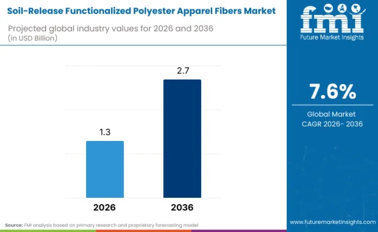 By 2036, FMI expects the soil-release functionalized polyester apparel fibers market to reach USD 2.7 billion, supported by: