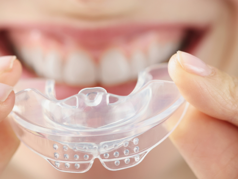 Alt text:Clear dental nightguard held in front of smiling teeth, showing how a custom mouthguard protects enamel and helps reduce tooth sensitivity caused by grinding.