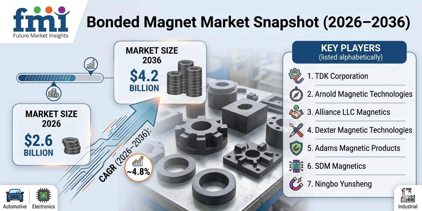 NEWARK, DE, UNITED STATES, April 2, 2026 /EINPresswire.com/ — The global bonded magnet market is valued at USD 2.6 billion in 2026 and is projected to reach USD 4.2 billion by 2036, expanding at a CAGR of 4.8% over the forecast period. Growth is supported by increasing demand for compact, high-performance magnetic components across electric mobility, consumer electronics, and industrial automation. Bonded magnets are gaining traction due to their design flexibility, lower weight, and ability to be molded into complex shapes, making them ideal for modern miniaturized systems.